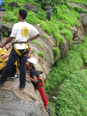 മലകയറ്റത്തില് പ്രമുഖനായ പ്രദീപ് ഖെല്ക്കറും സംഘവുമാണ് rappelling സംഘടിപ്പിച്ചത്. മുന്പൊരിക്കല് രത്നഗിരിയില് rappelling ചെയ്തതും പ്രദീപ് സാറിന്റെ കൂടെയായിരുന്നു. രണ്ട് കുട്ടികളുള്പ്പടെ117 പേരാണ് rappelling ചെയ്യാനെത്തിയത്. അതുകൊണ്ട് ഞങ്ങളുടെ (Nature Knights ടീമിന്റെ) ഊഴം വരാന് കുറെ സമയമെടുത്തു. ആ സമയം മുതലാക്കി, എല്ലാരും മുകളിലേയ്ക്ക് പോയി വെള്ളത്തില് കളിച്ച് തിമിര്ത്തു.